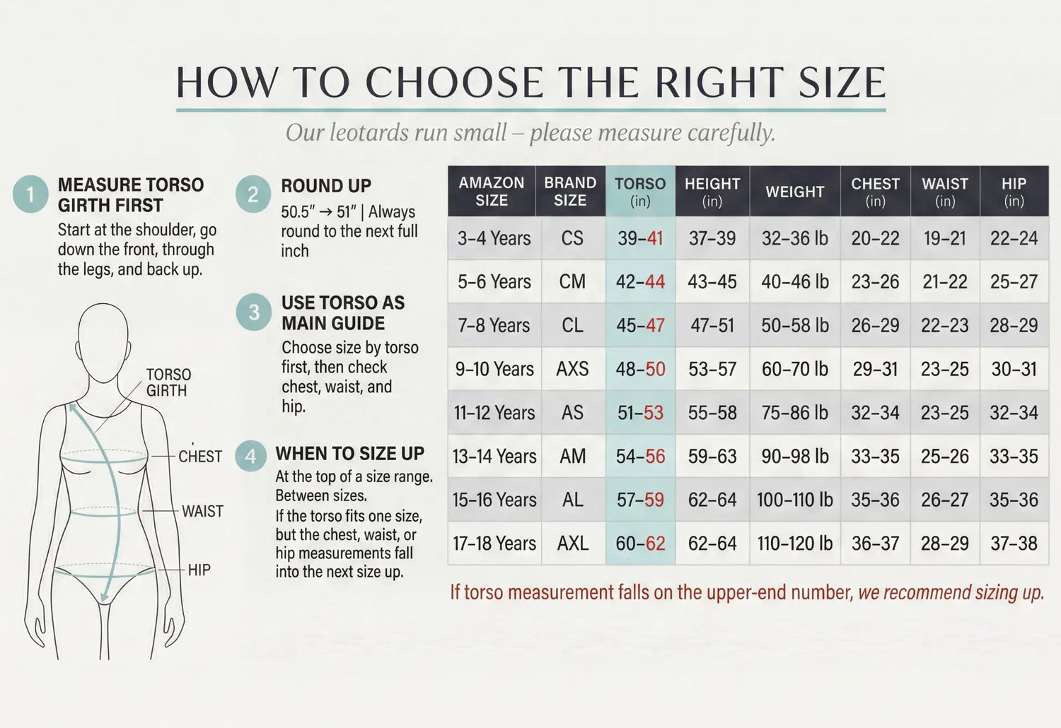 Since gymnastics leotards are designed to stretch, girth should always be the primary measurement when selecting a size. Choosing the correct girth ensures comfort, proper fit, and freedom of movement.